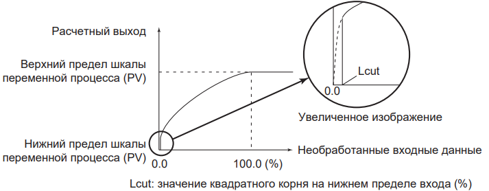 Расчетное значение квадратного корня на нижнем пределе входа может быть задано только при выборе "Square Root" (Квадратный корень) в качестве типа преобразования входного сигнала.