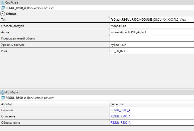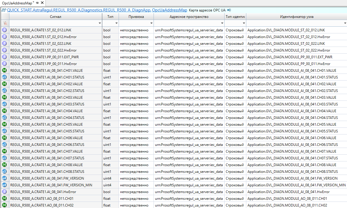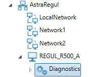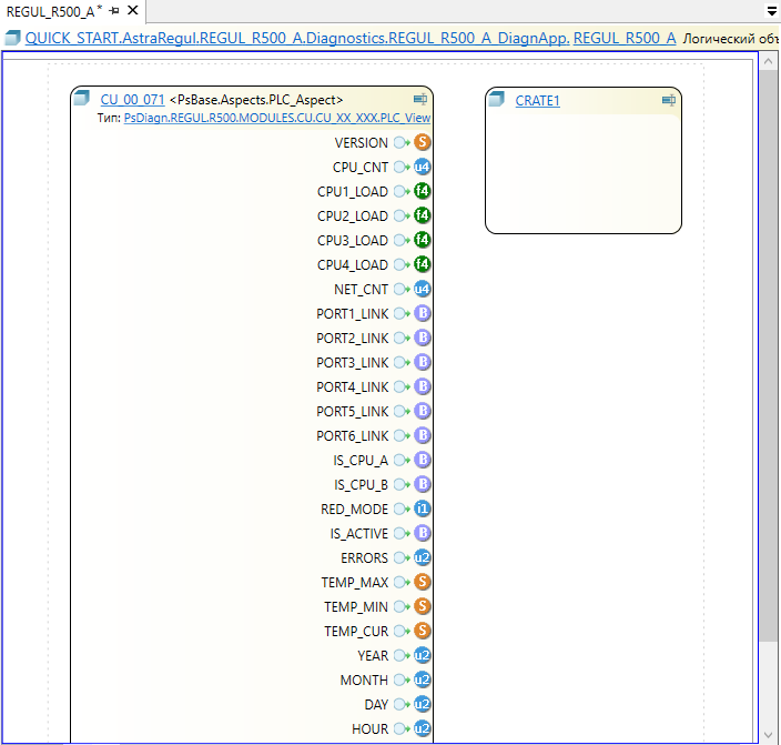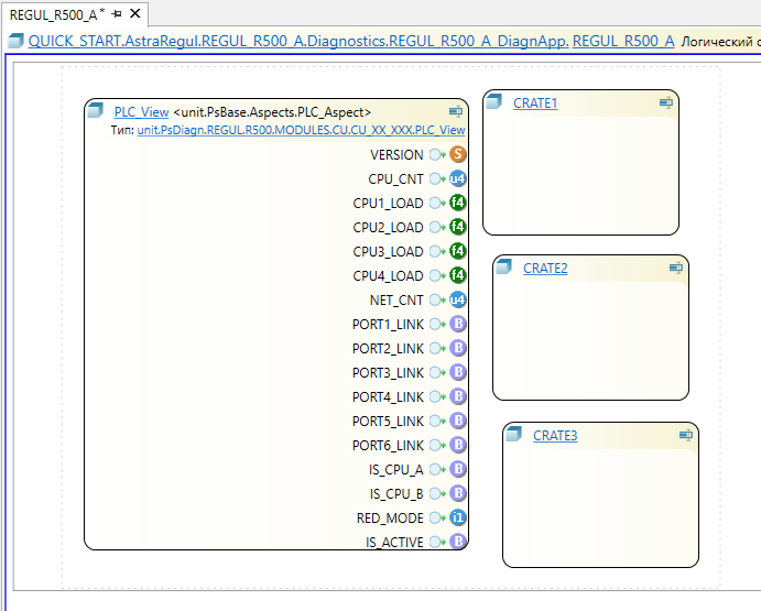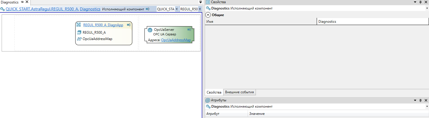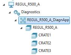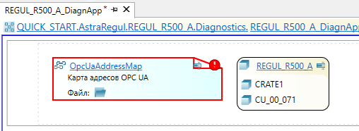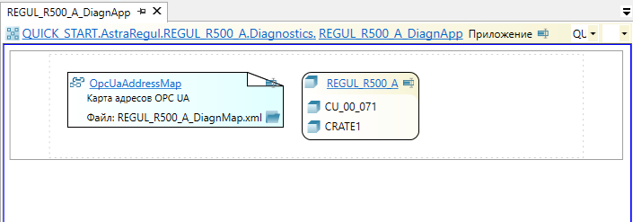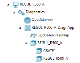 Приложение "REGUL_R500_[A/B]_DiagnApp" вместе с объектом контроллера и логическими элементами крейтов, а также компоненты "Карта адресов OPC UA" и "OPC UA Сервер" добавляется в приложение "Diagnostics" автоматически при выполнении экспорта проекта в Astra.IDE.