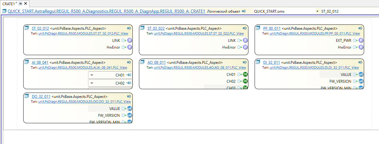 После экспорта необходимо создать структуру дерева объектов в логических объектах крейтов в приложении и заполнить карту адресов. Все остальные компоненты настраиваются автоматически с помощью плагина AstraRegul.