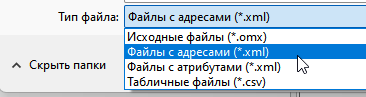В диалоговом окне выберите тип файла "Файлы с адресами (*.xml)".