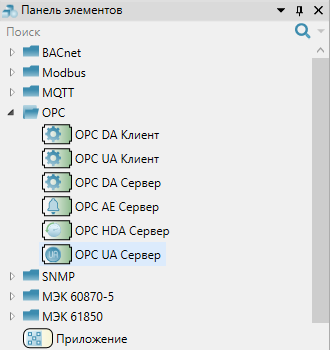 8. После формирования дерева объектов перейдите в "Приложение" и перетащите в рабочую область из "Панели элементов" компонент "Карта адресов OPC UA".