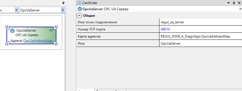 12. Выберите компонент "OPC UA Сервер" и в окне "Свойства" укажите настройки OPC UA сервера на ПЛК REGUL: