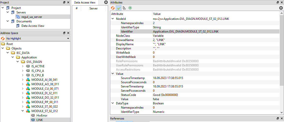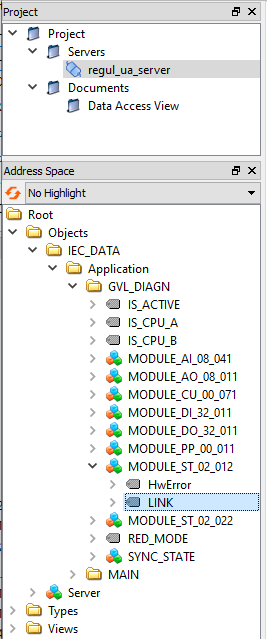 15. Откройте утилиту UA Expert и раскройте дерево сигналов сервера: "IEC_DATA" → "Application" →" GVL_DIAGN" → "MODULE_ST_02_12".