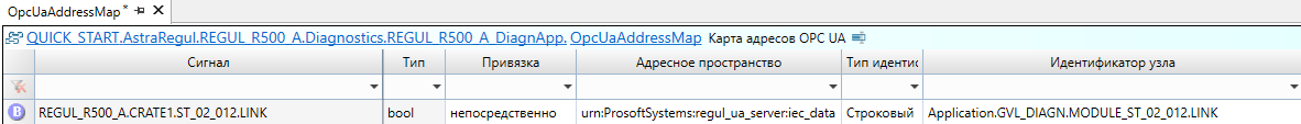 Идентификатор узла: полный путь к переменной в адресном пространстве сервера OPC UA (проект Astra.IDE).