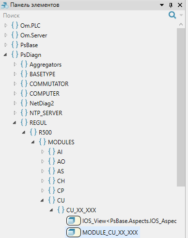 Перетащите объект "MODULE_CU_XX_XXX" (модуль ЦП) из библиотеки "PsDiagn" Панели элементов в рабочую область ПЛК А. Модуль ЦП рекомендуется размещать в структуре объектов отдельно от крейтов.