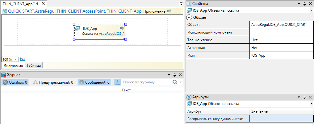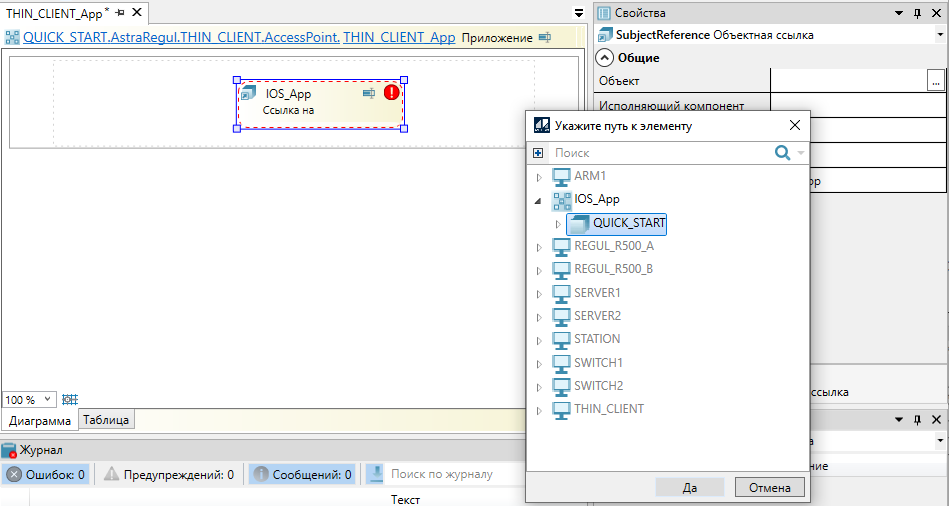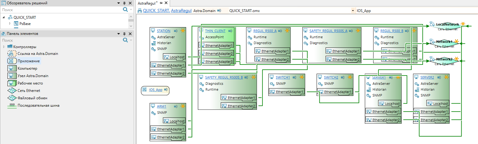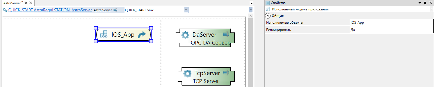 26. Перейдите в компонент "Astra.Server" инженерной станции и перетащите в рабочую область из панели элементов компонент "Исполняемый модуль приложения". Выделите объект и в окне "Свойства" укажите в качестве исполняемого объекта приложение "IOS_App". Повторите те же действия для всех серверов, где установлен компонент "Astra.Server".