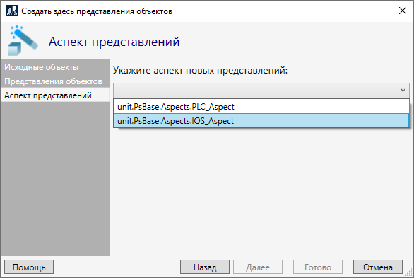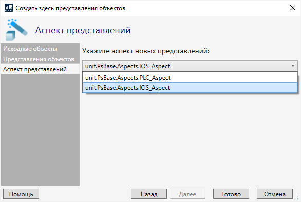 6. Укажите аспект "unit.PsBase.Aspects.IOS_Aspect" и нажмите кнопку "Готово".