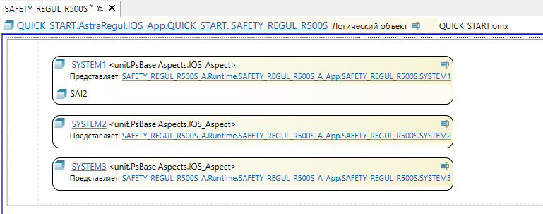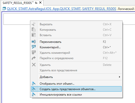 7. Перейдите в логический объект "SAFETY_REGUL_R500S". Кликните правой кнопкой мыши по свободной рабочей области и в контекстном меню выберите команду "Создать здесь представления объектов".