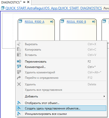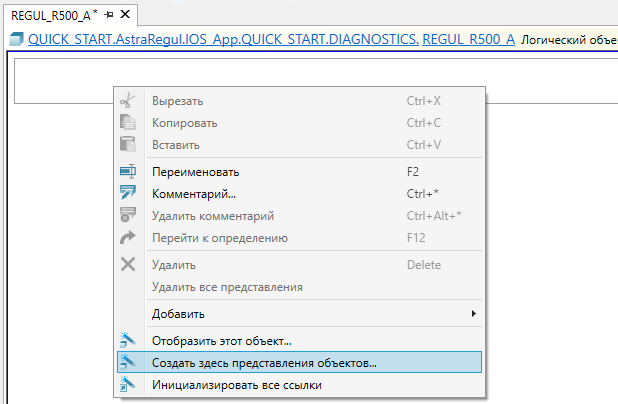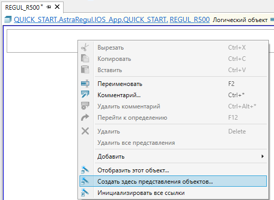 3. Перейдите в логический объект "REGUL_R500". Кликните правой кнопкой мыши по свободной рабочей области и в контекстном меню выберите команду "Создать здесь представления объектов".