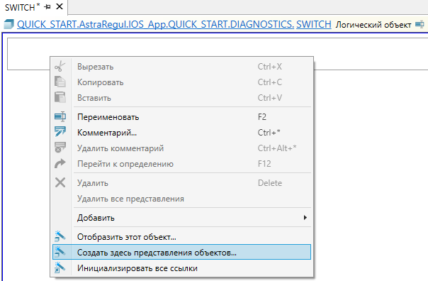 16. Перейдите в логический объект "SWITCH". Кликните правой кнопкой мыши по свободной рабочей области и в контекстном меню выберите команду "Создать здесь представления объектов".
