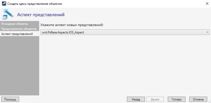 14. Укажите аспект представлений "unit.PsBase.Aspects.IOS_Aspect" и нажмите кнопку "Готово".