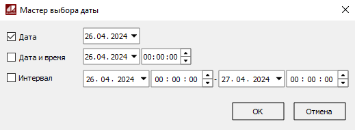 Для удобного задания диапазона времени генерации, срабатывания, деактивации или квитирования вызовите Мастера выбора даты, нажав кнопку