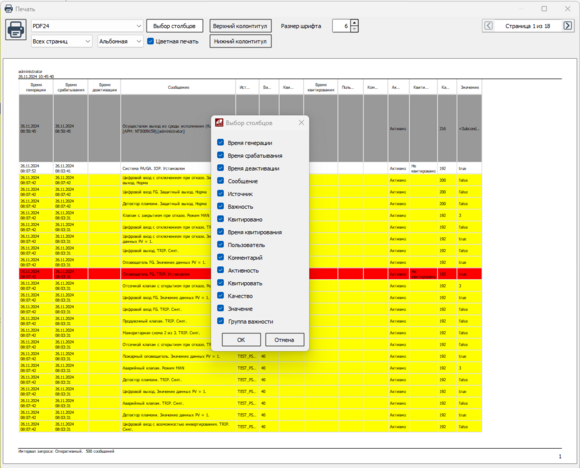 Вы можете выбрать столбцы таблицы событий, отметив нужные столбцы и настроить параметры верхнего и нижнего колонтитулов.