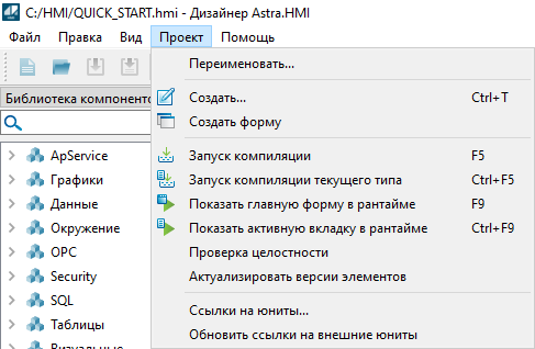 Чтобы скомпилировать весь проект, в меню "Проект" выберите команду "Запуск компиляции" (F5).