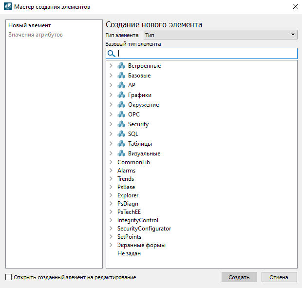 В открывшемся мастере создания элементов задайте значения полей Тип элемента и Базовый тип элемента.