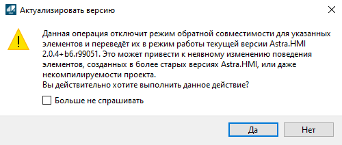 Чтобы принудительно актуализировать устаревшие версии элементов проекта выберите в меню Проект команду "актуализировать версии компонентов". Если в настройках проекта установлен флаг Подтверждать актуализацию версий, то откроется окно с подтверждением действия.