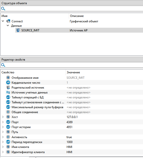 1. В проекте Astra.HMI добавьте новый источник AP и укажите ему следующие свойства: