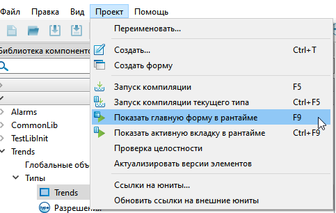 6. Запустите проект в режим исполнения клавишей F9 или воспользуйтесь командами из вкладки «Проект».