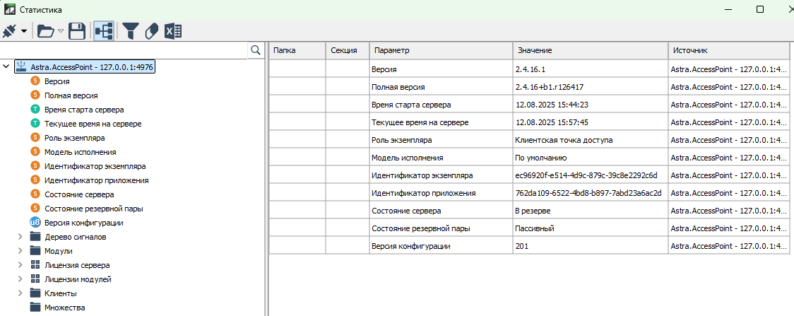 3.12.3.3.4. Просмотр статистики Astra.AccessPoint Порт подключения: 4976. Параметры в узлах Дерево сигналов, Модули, Клиенты, Лицензия сервера и Лицензия модулей идентичны параметрам статистики Astra.Server.