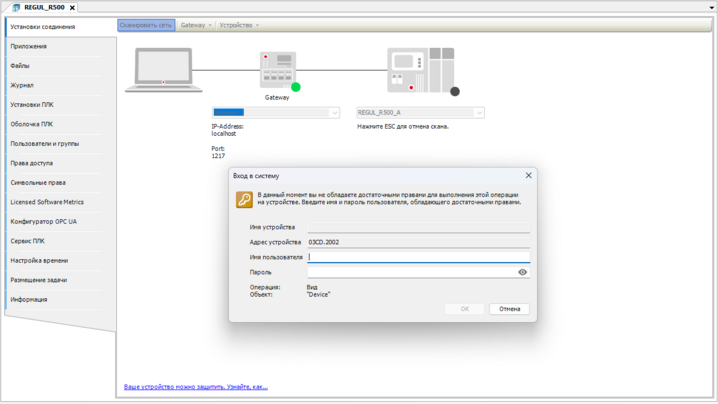 1. Установить соединения с ПЛК из рабочего проекта с вводом логина и пароля.