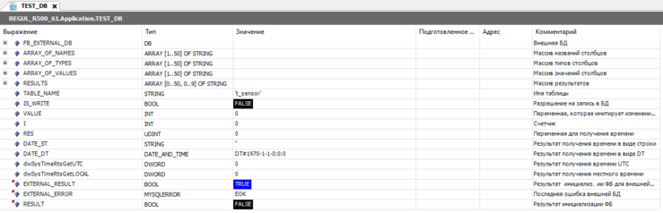 3. После запуска при отсутствии ошибок подключения на выходе "ERROR" и у переменной "EXTERNAL_ERROR" будет значение "EOK".