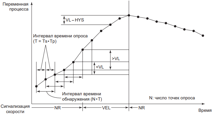 При обнаружении выхода изменения значения переменной процесса PV за определенный период времени за границу, обозначенную заданием сигнализации предела скорости VL, срабатывает сигнализация скорости изменения в положительном направлении VEL+, если изменение происходит в направлении возрастания. Аналогично, если изменение происходит в направления уменьшения, срабатывает сигнализация предела скорости изменения в отрицательном направлении VEL-.