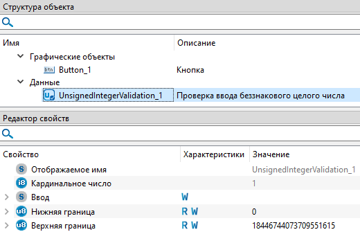 1. Определите условия валидации: добавьте на рабочую область компонент библиотеки Проверка ввода беззнакового целого числа (из группы om.automation.controls) и укажите значения свойств Нижняя граница и Верхняя граница.