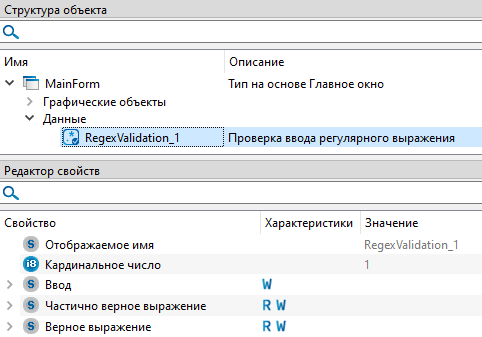 1. Определите условия валидации: добавьте на рабочую область компонент библиотеки Проверка ввода регулярного выражения (из группы om.automation.controls) и укажите значения свойств Частично верное выражение и Верное выражение. На рисунке ниже показано регулярное выражение для проверки адреса электронной почты.