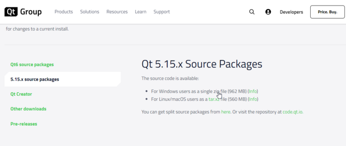 Для установки Qt 5.15.X необходимо выполнить его сборку из исходных файлов. Для этого скачайте с официального сайта исходные файлы.