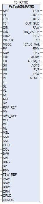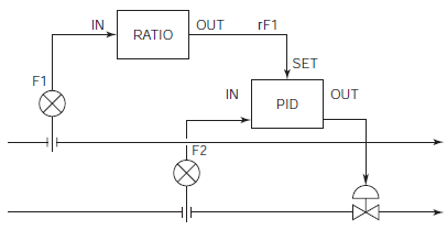 Блок установки соотношения (RATIO) вырабатывает значение управляющего выхода (MV) с учетом изменения переменной процесса (PV). Данный блок используется для установки и поддержания на постоянном уровне определенного соотношения между двумя регулируемыми переменными.