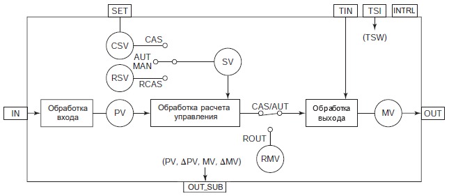 В любом автоматическом режиме (AUT, CAS или RCAS) расчетное выходное значение (CALC_VAL) проходит обработку выходного сигнала и задается в качестве значения управляющего выхода (MV).