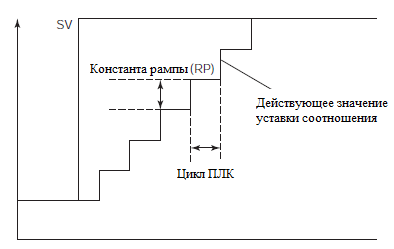 Функция ступенчатого изменения задания состоит в ограничении изменения действующего значения задания для соотношения (SVe) в ходе каждого цикла сканирования значением константы ступенчатого изменения (RP).
