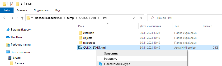 1. Запустите проект "QUICK_START" в дизайнере Astra.HMI. Для запуска проекта перейдите в папку с проектом "QUICK_START" → "HMI", нажмите правой кнопкой мыши по файлу "QUICK_START", и выберите команду "Изменить".