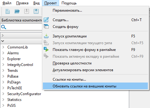 Если файл с внешней библиотекой расположен в папке "externals", но на вкладке внешние модули не отображается, в главном меню выберите "Проект" → "Обновить ссылки на внешние юниты".