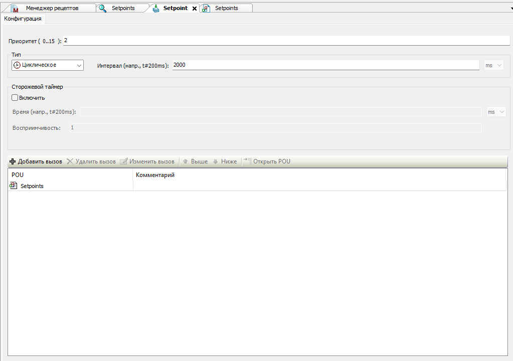 9. Настроить интервал и приоритет задачи и добавить вызов программы «Setpoints».