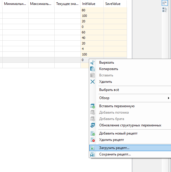 4. Открыть добавленную группу рецептов и добавить два рецепта (столбца) «InitValue» и «SaveValue». Для этого в области таблицы нажмите правую кнопку мыши и в выпадающем списке выберите команду «Добавить новый рецепт».