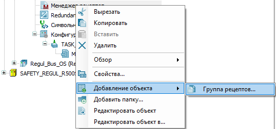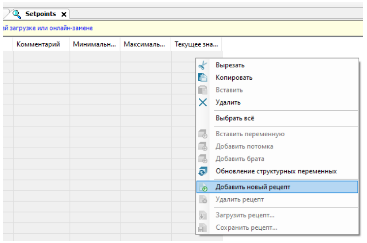 3. Добавить в «Менеджер рецептов» элемент «Группа рецептов» (задайте название, например «Setpoints»).
