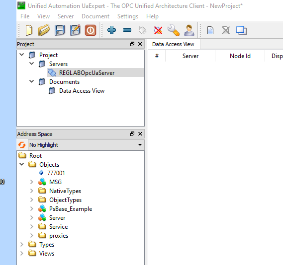7. После подключения отобразится адресное пространство сервера. Дерево сигналов сервера находится в каталоге Objects.