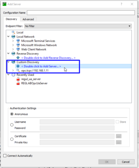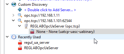 5. Раскройте именование узла REGLABOpcUaServer и выберите способ подключения "None". Нажмите кнопку "ОК".
