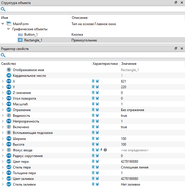4.4.1.4.2.4.12.22. Прямоугольник Компонент Прямоугольник применяется на мнемосхемах при рисовании объектов технологического процесса и, в некоторых случаях, как альтернатива Кнопке, так как имеет более широкие возможности для обработчиков событий.