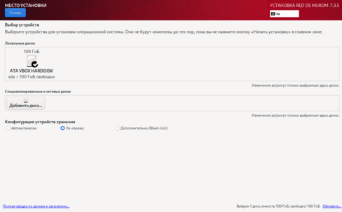 4. Выберите необходимый диск для установки, а также метод конфигурации "По-своему" и нажмите кнопку "Готово".