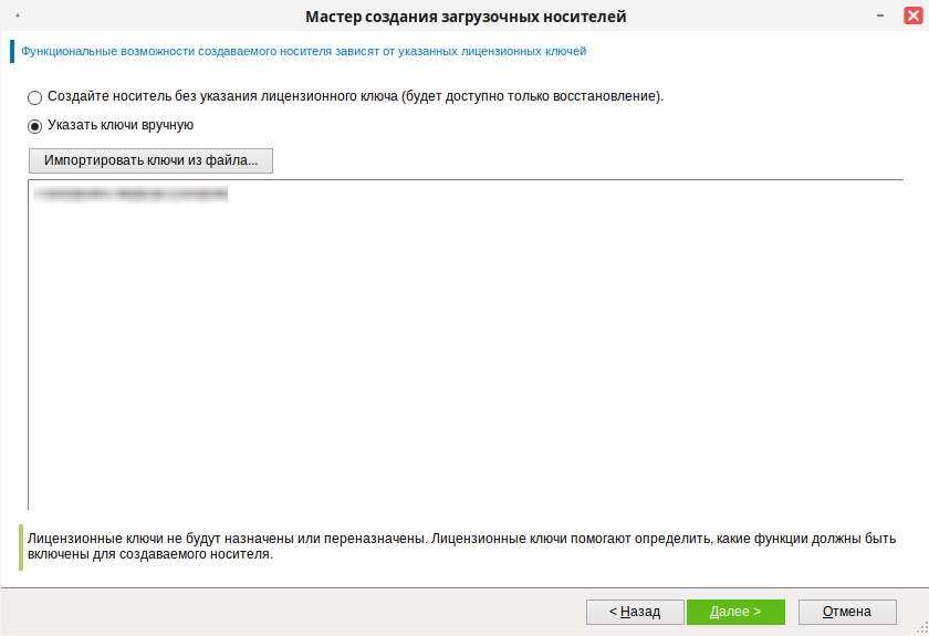 3. Выберите пункт "Указать ключи вручную" и укажите лицензионный ключ Кибер Бэкап. Этот ключ используется для определения функций, которые будут представлены на загрузочном носителе. Нажмите кнопку "Далее".