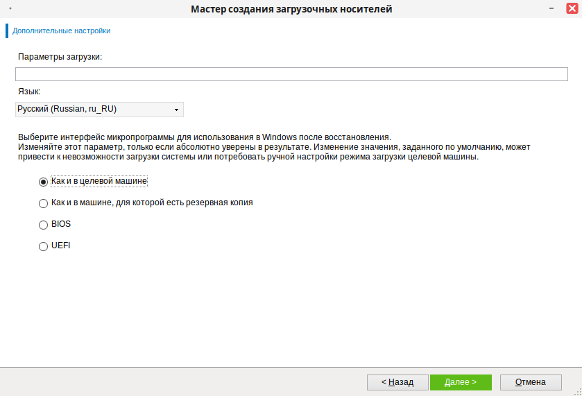4. Выберите "Тип загрузочного носителя": По умолчанию (носители на основе Linux).