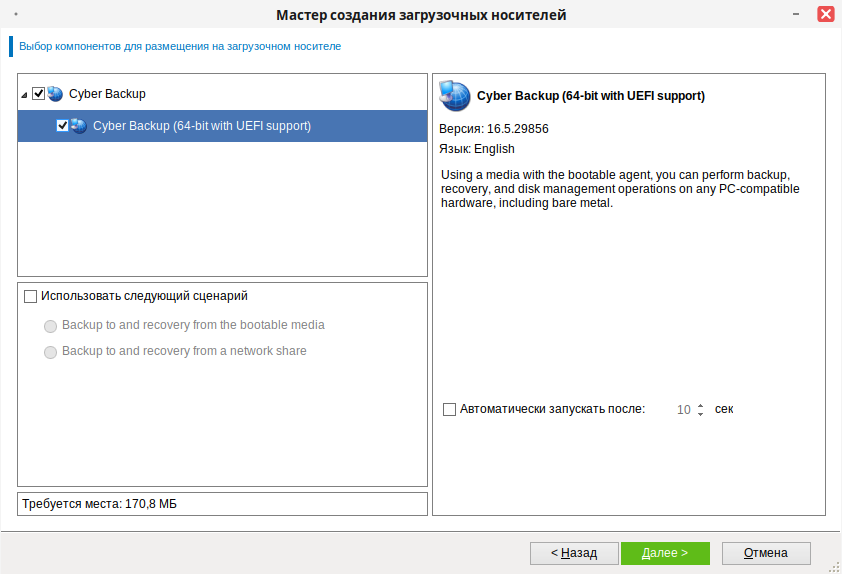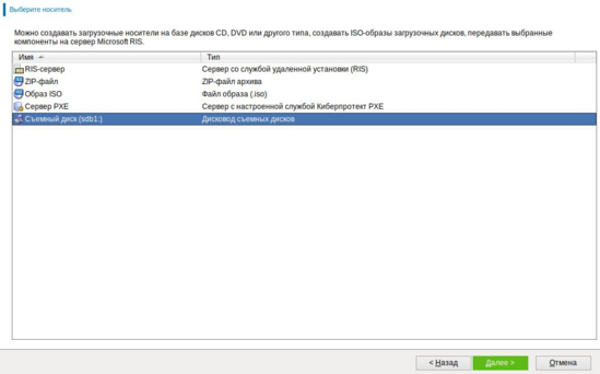 6. Выберите компоненты, которые будут установлены на загрузочном носителе в зависимости от типа компьютера и нажмите кнопку "Далее".