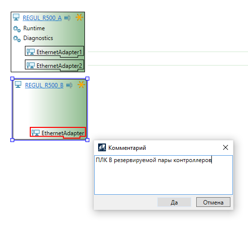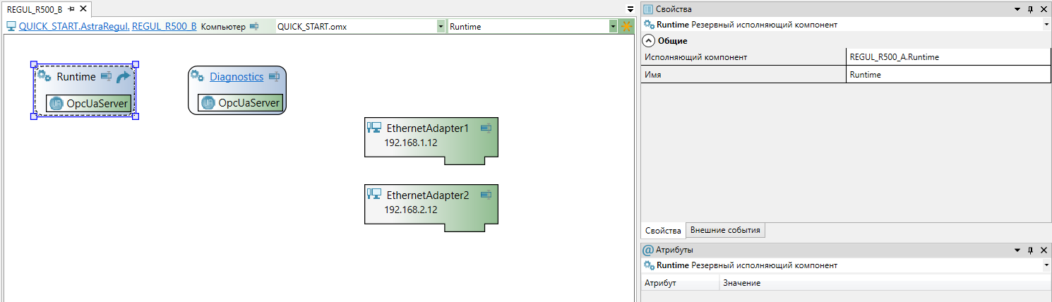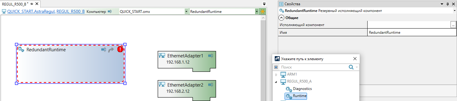 Выделите элемент и в окне "Свойства" задайте имя "Runtime", укажите путь к исполняющему компоненту ПЛК A резервной пары.
