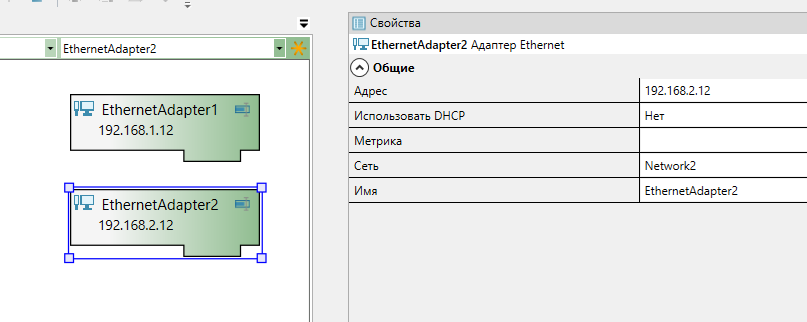 Перейдите в компонент "Компьютер" и перетащите в рабочую область из "Панели элементов" необходимое количество адаптеров Ethernet.Рекомендуется использовать резервируемую линию связи (два адаптера Ethernet).У каждого адаптера необходимо настроить свойства "Имя", "Адрес" и "Сеть". В свойстве "Адрес" укажите IP-адрес порта ПЛК. Сеть выбирается из выпадающего списка: для каждого адаптера своя сеть.
