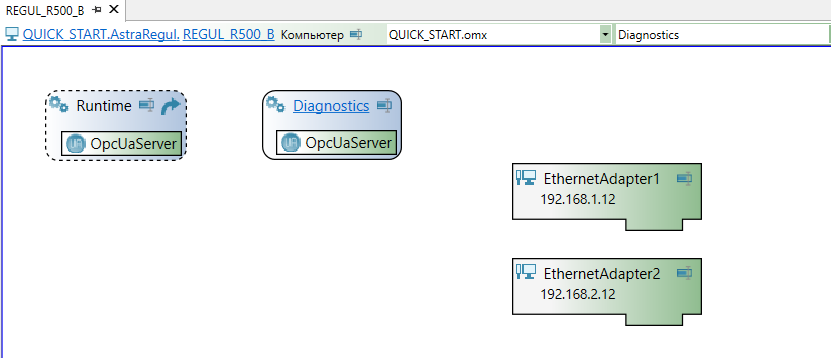 После экспорта необходимо создать структуру дерева объектов в приложении "Diagnostics", аналогично с основным ПЛК, и заполнить карту адресов. Все остальные компоненты резервного ПЛК настраиваются автоматически с помощью плагина AstraRegul.