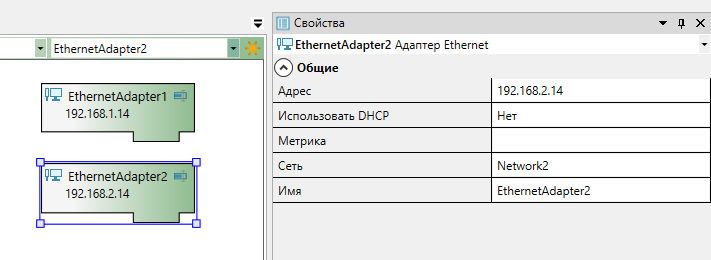 Перейдите в компонент "Компьютер" и перетащите в рабочую область из "Панели элементов" необходимое количество адаптеров Ethernet.Рекомендуется использовать резервируемую линию связи (два адаптера Ethernet).У каждого адаптера необходимо настроить свойства "Имя", "Адрес" и "Сеть". В свойстве "Адрес" укажите IP-адрес порта ПЛК. Сеть выбирается из выпадающего списка: для каждого адаптера своя сеть.