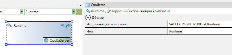 Выделите элемент и в окне "Свойства" задайте имя "Runtime", укажите путь к исполняющему компоненту ПЛК A резервной пары.