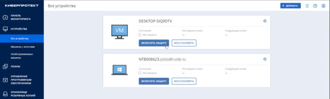 1. Перейдите на вкладку "Устройства" и выберите устройства, которым необходимо применить созданный план резервирования. Для применения плана нажмите кнопку "Включить защиту" на необходимом устройстве.